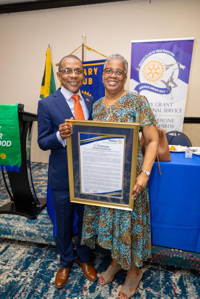 In Courtney Campbell, we find the embodiment of vocational excellence as a tool for nation-building. He has used his skills in finance and leadership to create a more resilient and inclusive Jamaica. For his lifelong adherence to the highest ethical standards andhis tireless devotion to the upliftment of his fellow man, the Rotary Club of New Kingston is profoundly honoured to present him with the Gary Grant Vocational Service Award on this the Thirtieth day of January in the